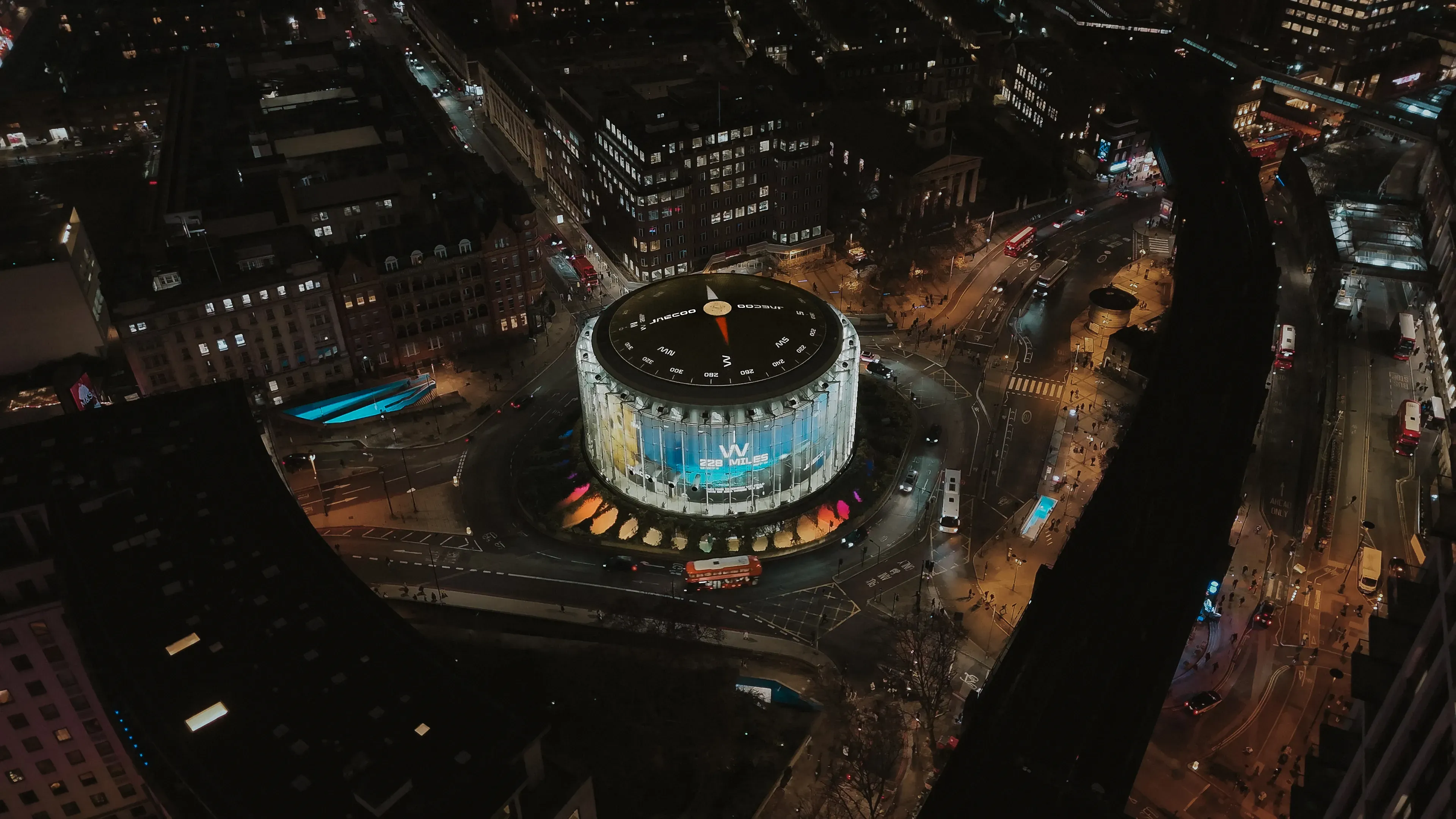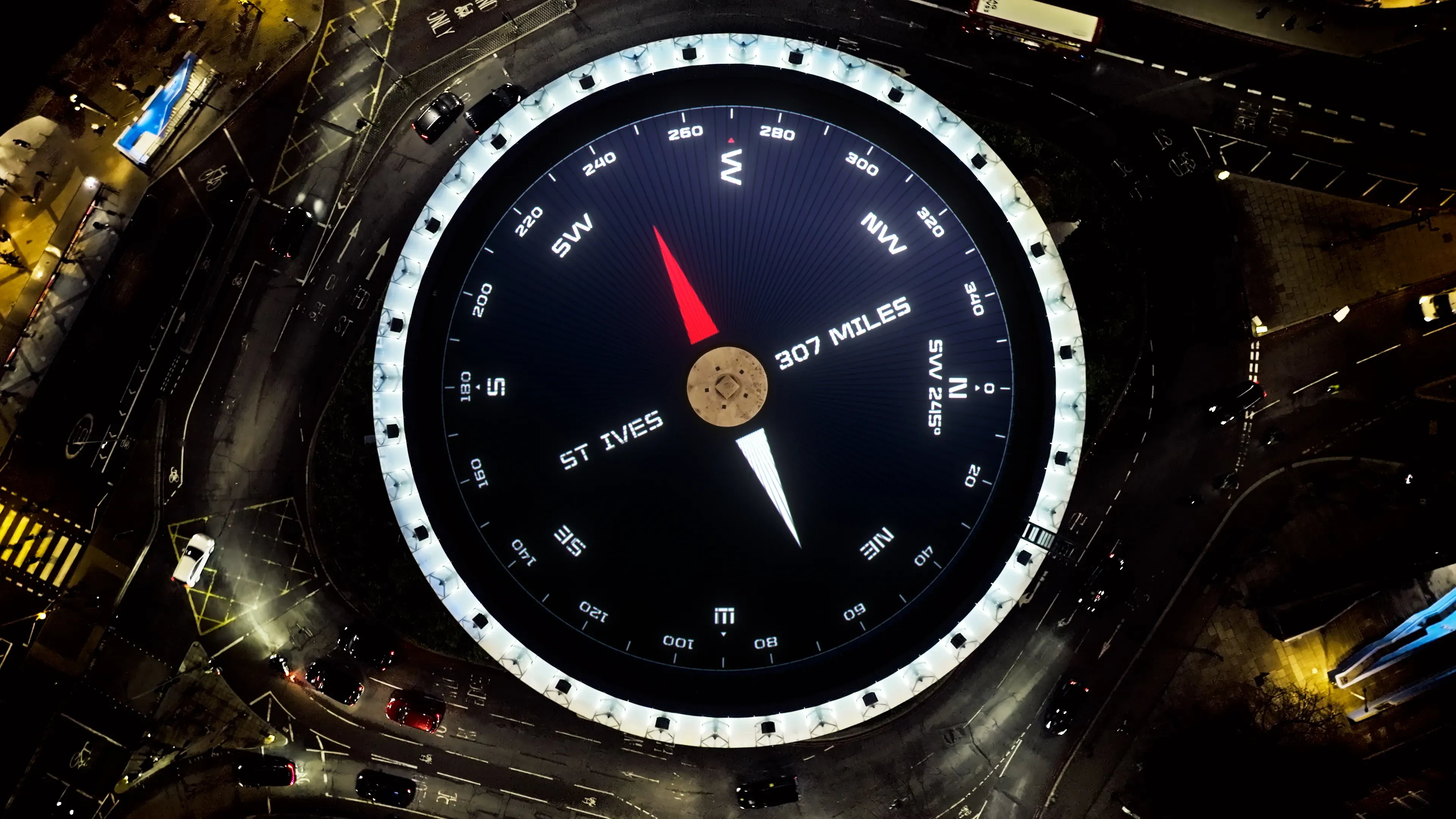 In December, JAECOO placed a functioning compass on top of the cinema - spanning 1,256.6 m² and projected from a rooftop adjacent to the BFI IMAX - the first time advertising has ever appeared on the site. Visible across the capital, the installation pointed Londoners towards intrepid destinations across the UK, such as Seaford, 91 miles and 160° South, or Snowdonia, 228 miles and 302° North West, encouraging spontaneous escapes from the city, and reminding audiences that adventure is never far away. Each side of the BFI IMAX included the provocation “This time tomorrow you could have no idea where you are.”
